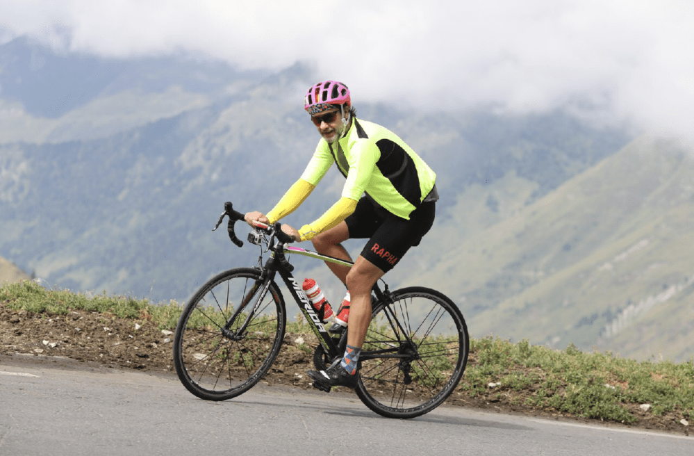 Una de las formas de medir la popularidad de los puertos es la densidad de fotógrafos que aspiran a venderte la imagen perfecta de tu hazaña. No es extraño verlos acampados, con su silla, sombrilla, el disparador remoto con el controlan una segunda cámara… Los recuerdo en las cunetas del Stelvio, del Alpe d’Huez y, por supuesto, aquí, en el Tourmalet. En ocasiones, si la competencia es feroz, te meten en el bolsillo trasero del maillot una tarjeta con el código para localizar tu foto en el mastodóntico catálogo de instantáneas. Hay una recta en el Mont Ventoux, ya pasado el Chalet Reynard, cerca del monumento a Tom Simpson, en la que te encuentras a cuatro o cinco en el espacio de medio kilómetro. Luego, cuando ves las fotografías, descubres que es el sitio en el que se logra un encuadre que incluye la cima al fondo de la composición. En esta imagen, sin embargo, se intuye la proximidad de la cumbre, se refleja el logro ya casi conseguido. Si os fijáis, se ve que llevo bastante ropa, pero que no está abrochada. ¿Por qué? Porque ya había llegado a la cumbre y había descendido para filmar la llegada de Julia a la cima, a la que persigo pero no aparece en la imagen. Se ve, incluso, la cámara bajo el manillar.