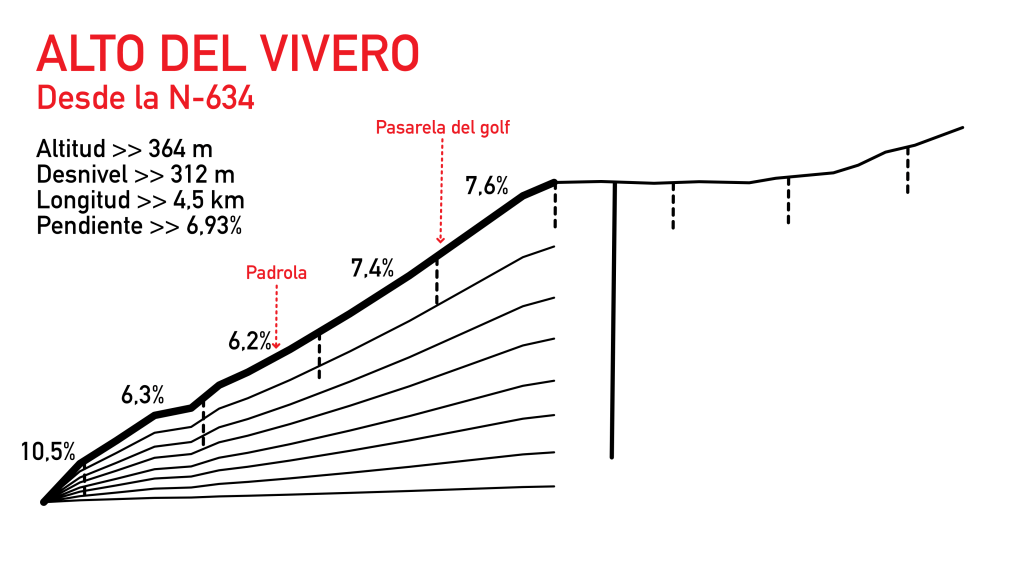 A partir de aquí la pendiente va a ser bastante constante a lo largo de toda la subida. Es verdad que el primer kilómetro tiene una media más alta, pero se debe sobre todo a esa curva en la que el porcentaje llega al 14%, sobre todo si uno la toma por dentro. Pero bueno, mejor al principio que al final.